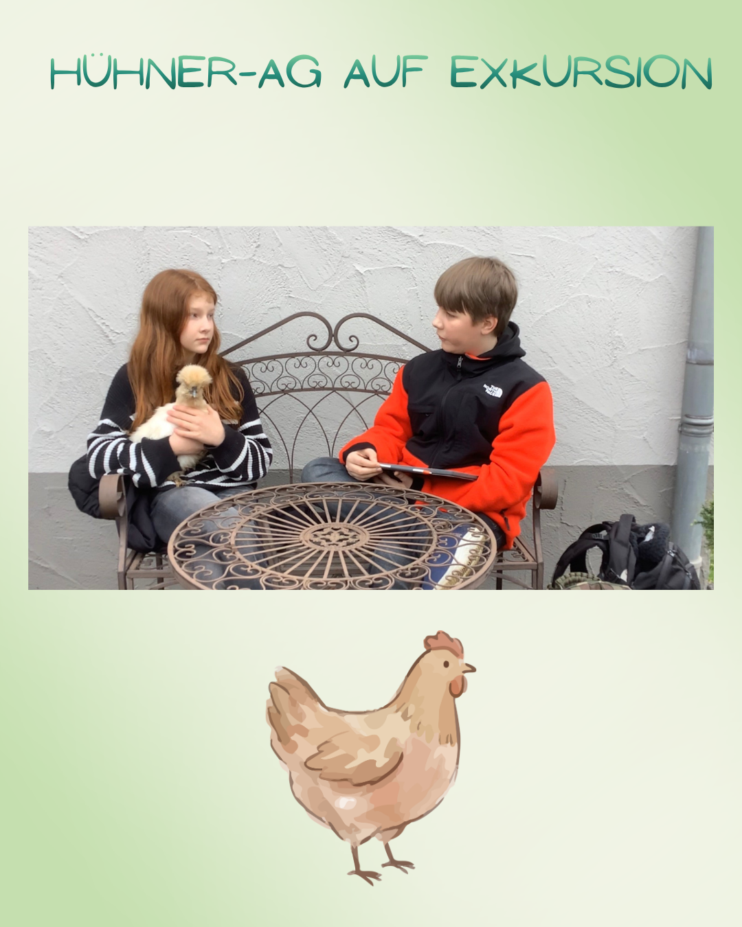 Als Gastgeschenke gab es von den AG-Mitgliedern Leckereien für die Hühner und Schokolade für ihre Besitzerin. Die Schülerinnen und Schüler erfuhren beim Interview mit Emma viel über die Haltung und das Verhalten von Hühnern und erlebten live, wie interessant, intelligent und zutraulich diese Tiere sein können.
