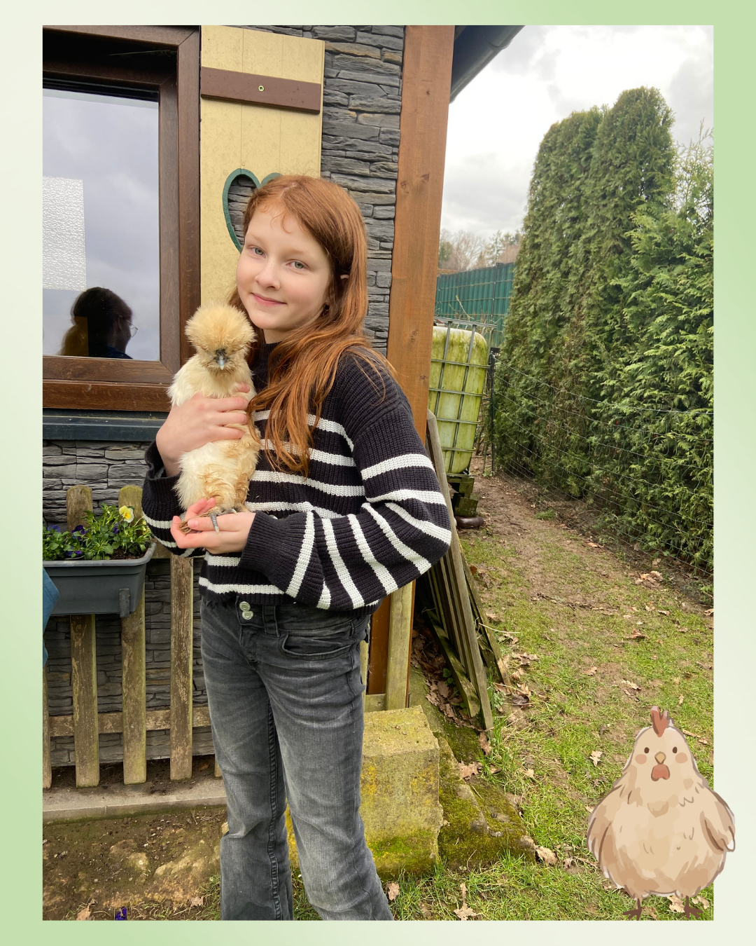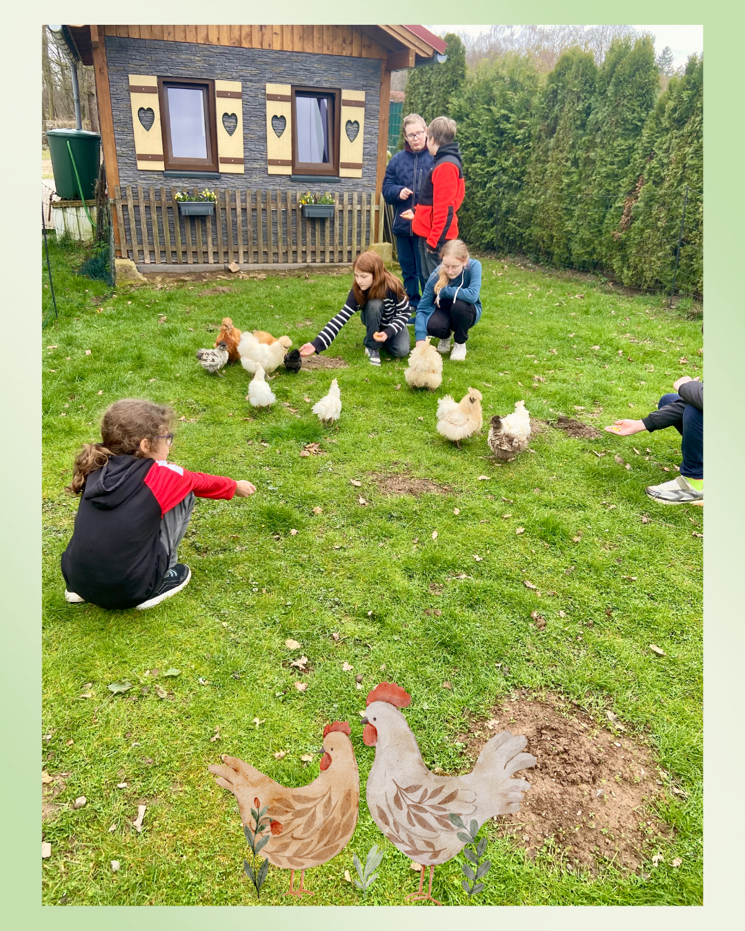 Vergangene Woche hatten die Mitglieder der Hühner-AG die Möglichkeit, „echte Hühner“ in artgerechter Haltung zu erleben. Emma aus der Klasse 5a und ihre Familie hatten nach Weierweiler eingeladen, um dort ihr Hühnergehege mit ihren Seidenhühnern zu besichtigen.
